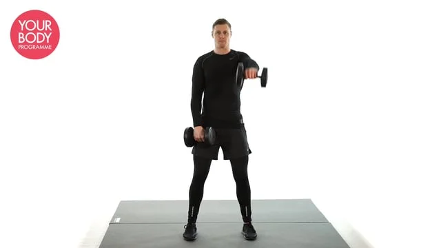 Stand with your feet hip width apart. Hold a dumbbell in each hand and alternately raise them in front of you to shoulder height with slight elbow flexion. Lower under control.