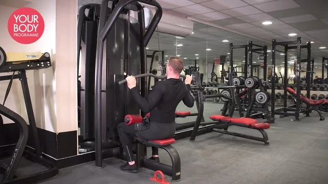Sit on the lat pull down machine with a wide overhand grip. Retract the shoulders, lean the torso backwards an inch and pull the bar towards your breastbone. Keep the chest lifted and core engaged. Raise the bar with control maintaining an open position across the chest.