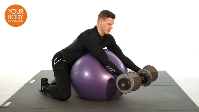 Kneel and lean over a swiss ball. Begin with your arms extended over the ball. Maintain neutral spine and engage your core. Flex your elbows and raise the dumbbells towards your shoulder. Lower with control.