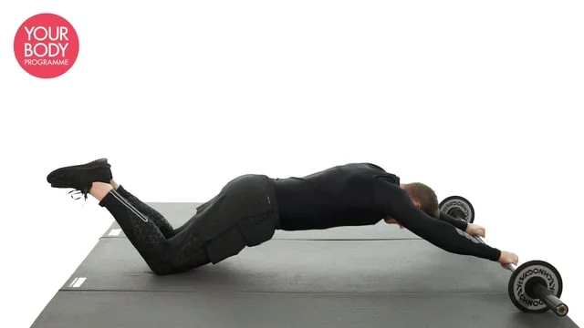 Kneel and hold onto a barbell in front of you with your arms extended and hips forward. Engage your core and roll the bar forward. Extend the arms as far forward as possible maintaining neutral spine. Draw the bar back to the starting position.