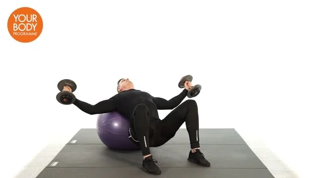 Support your upper back on a swiss ball and lower your hips towards the floor. Hold the dumbbells above you with slight elbow flexion. Inhale as you open the arms out to the side until they are parallel with the torso. Exhale as you raise the dumbbells. Use your core to stabilise the body.