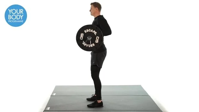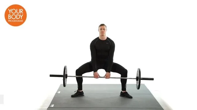 Stand with your feet wide, toes turned out slightly and hold a barbell in front of you. Bend the knees pressing them outwards into a sumo squat. Push your heels into the floor and extend your legs. Maintain neutral spine throughout.