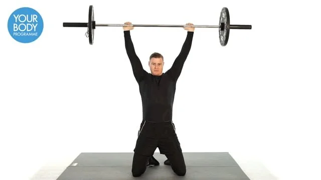 Kneel and hold a barbell in front of you with your hands placed slightly wider than shoulder width. Begin with the arms bent and bar at shoulder height. As you exhale extend the arms overhead and maintain neural spine. Inhale as you lower.
