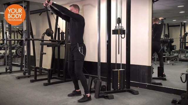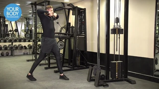 Stand in a staggered stance and take hold of cables from either side of you at chest height. Stand slightly in front of the cables and extend the arms. Bend the elbows allowing the cables to come towards your shoulders then press forward to extend the arms.