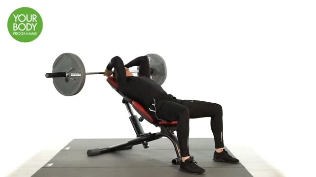 Lie on an incline bench and with a narrow grip hold a barbell above. Keep your upper arm in a fixed position as you lower the bar behind your head, the elbows should not move or flare to the side. Extend the arms as you raise the bar upwards.