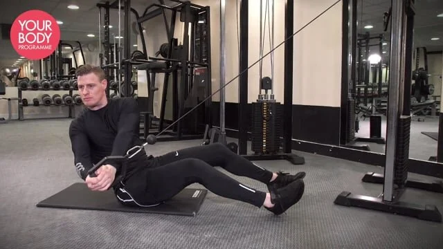 Sit upright with your knees bent and feet on the floor. Hold a high cable in both hands with the arms straight and lean the torso backwards engaging the core. Rotate the torso taking the cable downwards and to the side of the body, keep the chest lifted and navel drawn to spine.