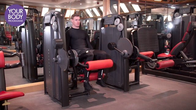 Sit upright on a hamstring curl machine and engage your core. Press downward with both legs and bend the knees. Ensure to flex the knees as much as possible.