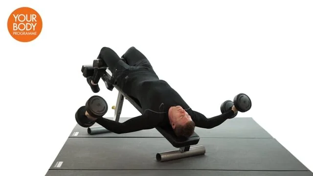 Lie on a decline bench and hold dumbbells above you with slight elbow flexion. Inhale as you open the arms out to the side until they are in line with the shoulders. Exhale as you raise the dumbbells maintaining slight elbow flexion.