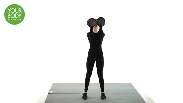 Stand feet hip width apart and hold dumbbells with palms facing forward and arms bent. Extend the weights overhead without over arching the lower back, maintain neutral spine. Bend the arms and lower under control, keep the chest open.