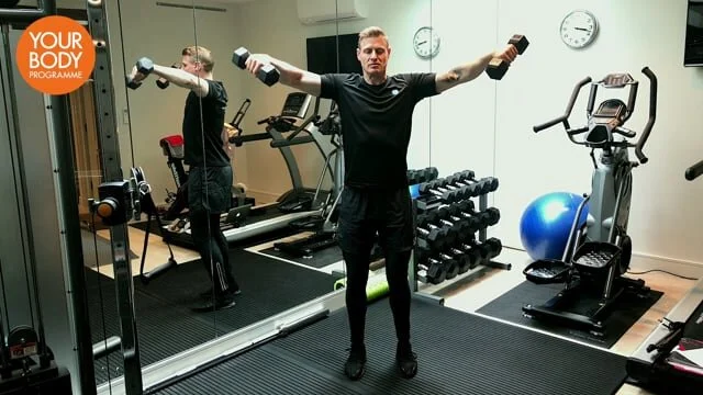 Stand with your feet hip width apart. Hold a dumbbell in each hand and raise them laterally to shoulder height with slight elbow flexion. Lower under control.