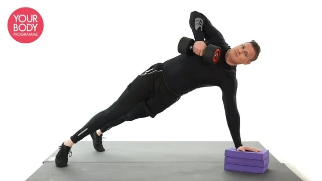 Perform a plank on 1 hand (placed onto a block) and hold a dumbbell in the other. Engage your core to maintain stability and pull into a single arm row. Allow the body to rotate and raise the elbow. Make sure your wrist is placed directly under your shoulder.