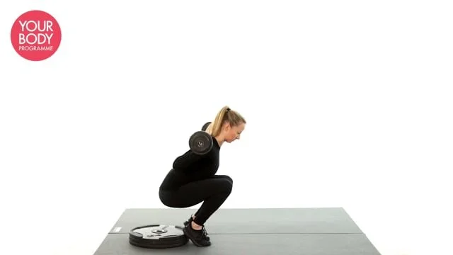 Stand with your feet close together and heels raised onto a plate. Hold a barbell on your shoulders and lower into a squat. Take the squat as deep as possible keeping your chest lifted. Allow the knees to come slightly forward of the toes.