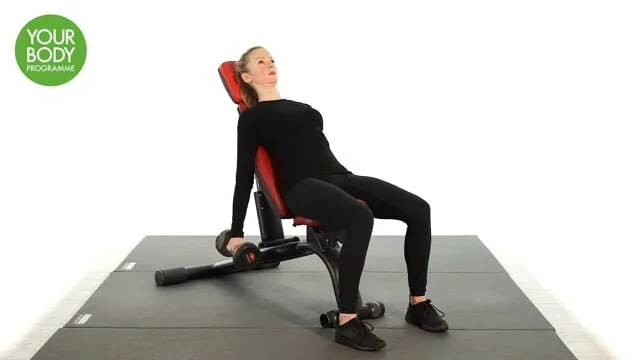 Sit on an incline bench and hold a dumbbell in each hand. Begin with the arms extended towards to floor, and as you bend the arms maintain the positions of the elbows, keeping them slightly behind the line of the body. Bring the weights to the shoulders then lower under control.