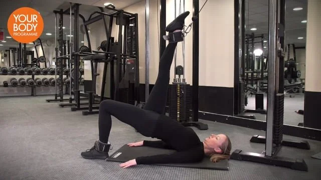 Lie on your back with 1 foot attached to a high cable behind you and place the other onto the floor with the knee bent. Begin with the hips raised into a bridge position and hold throughout. Press the leg down towards the floor with the knee extended. Raise under control.