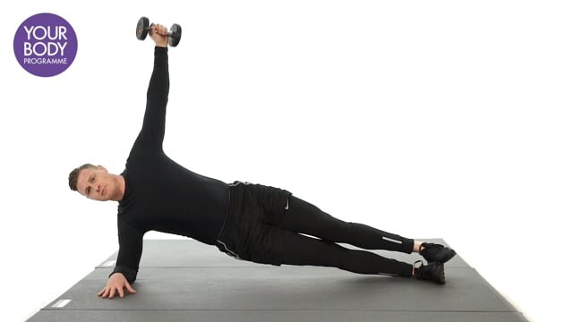 Lie on your side and place your weight onto your forearm with your shoulder directly over your elbow. Stack your feet on top of each other and raise the body. Hold a dumbbell in the free hand then rotate the torso taking the weight underneath the body then extend the arm to the ceiling.