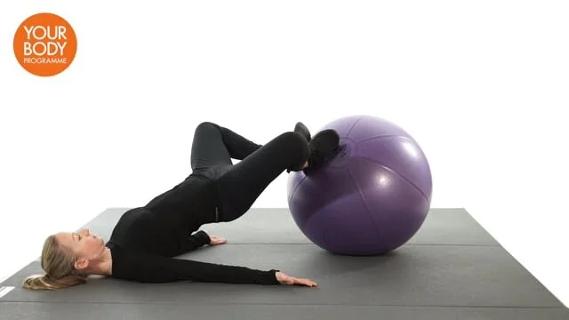Lie on your back with your legs straight, feet on a swiss ball and hips raised. Place your arms by your side for support. Turn your toes and knees outwards as you bend your legs and roll the ball towards you, do not allow the hips to lower. Extend the legs.