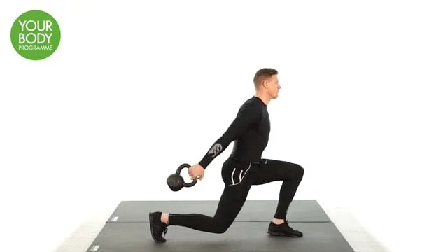 Hold the kettlebell in 1 hand and swing it backwards, simultaneously take the same leg back into a lunge. As the bell swings forwards to shoulder height step together, change hands and repeat the movement to the other side. Be aware of knocking the knees with the kettlebell.
