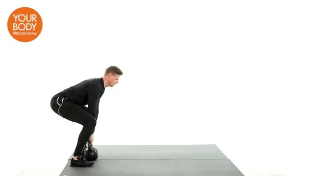 Perform a kettlebell deadlift. Ensure you hinge from the hips and keep the back in neutral as you lift the bell, do not round the lower back. Place the bell onto the floor, walk out on your hands and lower into a plank position on your forearms. Push back onto your hands and walk them back to the feet.