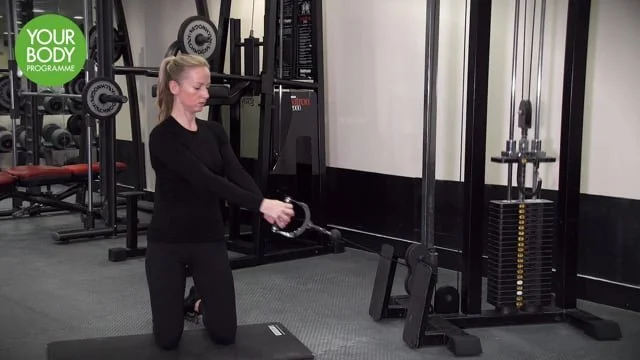 Kneel side on to the cable. Engage your core, keep your arms lengthened rotate the torso and raise the cable upwards in a smooth motion. Keep your shoulders down. Lower under control. Breathing: exhale on the raise / inhale on the lower.