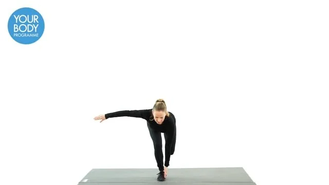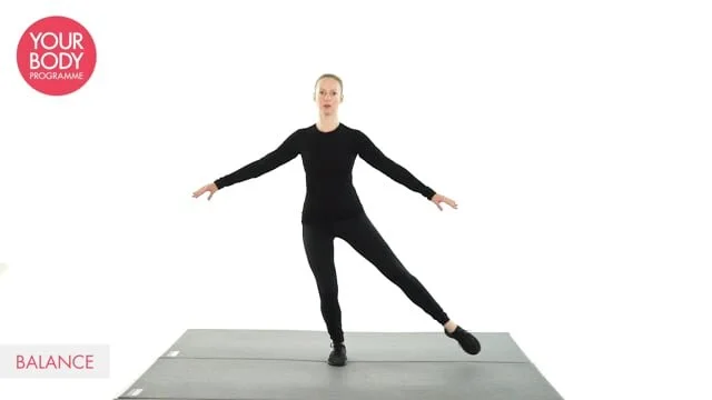 Stand on one leg. Keeping the static leg with a slight bend and straight, touch the opposite leg to the floor in front, to the side and behind. Simply touch the foot on the floor and return to a balanced position. Do all three movements 5 times.
