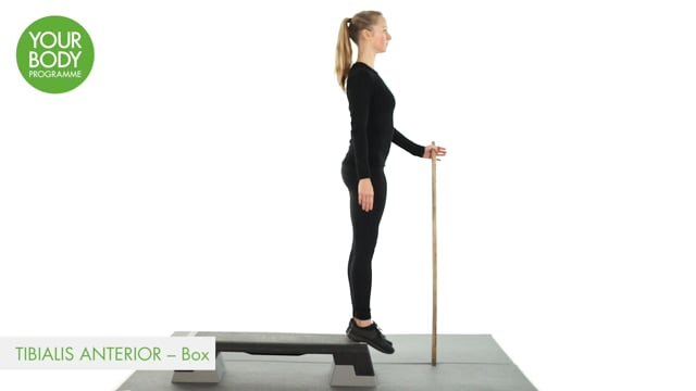 Raise your foot onto a surface and lean your body forward. Flex the foot bringing the toe towards you.