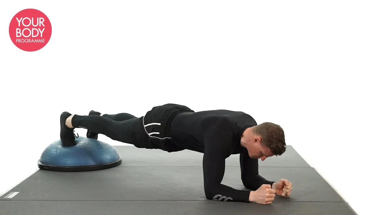 Place your weight onto your forearms, feet onto a bosu (dome side up) and raise the body. Engage your core and create a straight line from head to feet. Alternately push up onto your hands and lower back onto your forearms. As you push up the hands should replace to position of the elbows.