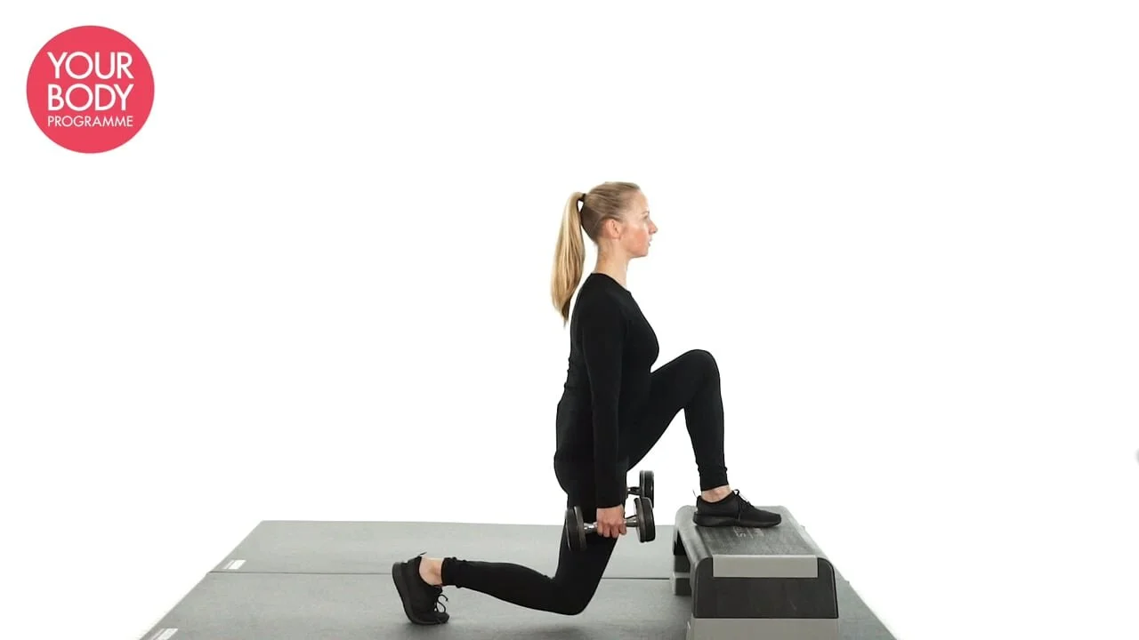 Stand with 1 foot forward and the other foot back behind you with the heel raised. Hold dumbbells to the shoulders. Lower into a lunge position until the back knee is just off the floor and both knees are at right angles. Then jump and switch legs landing in a lunge, continue.