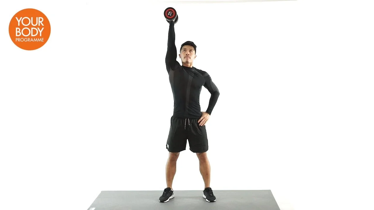 Take one arm overhead and bend at the elbow. Apply pressure with the opposite hand and keep the head raised.