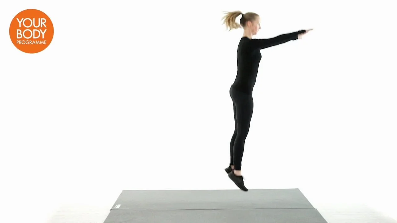 Spring from foot to foot on the spot. Bring the knee up as high as possible. Use the arms in a running action. Keep the tempo fast.